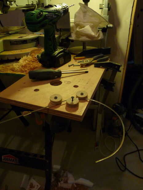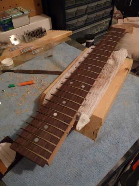 Construí una herramienta con 3 ruedas de madera para crear un radio constante. Hacerlo un poco más curvado que el tablero del traste.