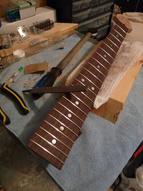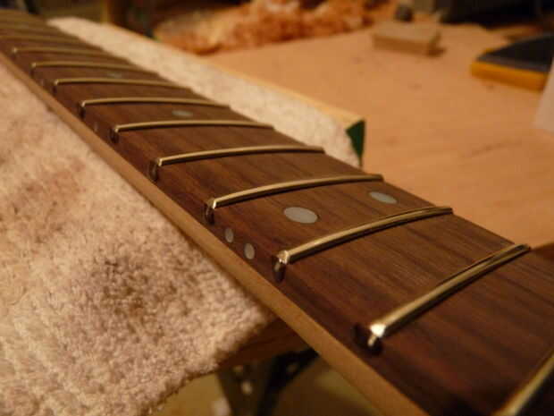 Corte los trastes un poco más largos que el ancho del cuello y aplicar pegamento instantáneo en la parte inferior de cada traste. Utilice un martillo pequeño para empujar rápidamente en su lugar.