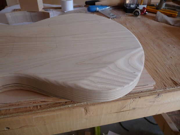 Muchas guitarras eléctricas tienen un bisel en la parte superior para acomodar el espacio para el brazo del jugador. Usé un plano de la mano y lijar los bordes agudos.