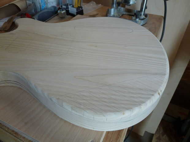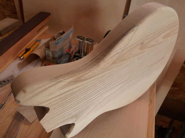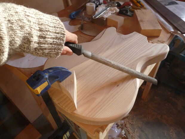 La parte posterior de la guitarra también es biselada para evitar moretones tu caja torácica. La mejor herramienta es un simple archivo bastardo y un papel de lija.