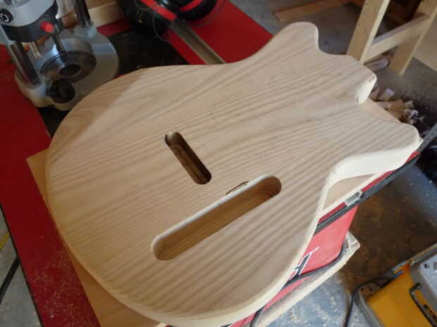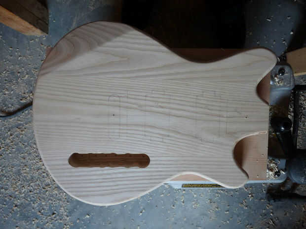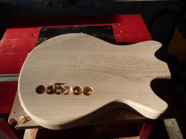 Para esta guitarra, la electrónica se sentará en una ranura en la parte delantera del cuerpo. I utilizar una pieza Forstner para eliminar la mayor parte de la madera, había tallada el resto con un cincel y utiliza una broca de flauta recta para suavizar los bordes.