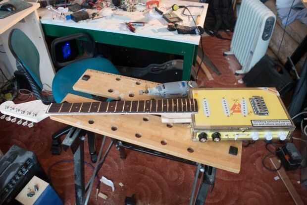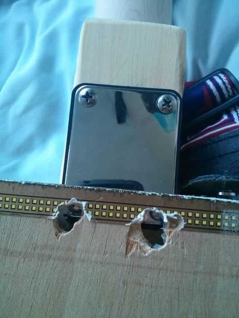 Bastante fácil pero es fundamental que el cuello va en recta. Mida cuidadosamente y perforar el cuello. Asegúrese de que no olvide incluir la placa posterior metálica. Tuve que hacer un par de agujeros en la caja para taladrar los tornillos de la parte inferior dos.