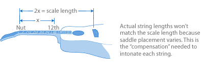 Si su 1930 Gibson L-OO, por ejemplo, medidas de 12-3/8" en el traste 12, entonces la longitud de la escala de guitarras es el doble una escala de 24-3/4". Para el afinado, la silla de montar de guitarras se colocará por lo que se añade una pequeña longitud de cadena extra. Esta longitud extra se llama compensación y significa que la longitud de la cadena real es más larga que su escala de medición de 24-3/4. En el centro de la silla será más cerca de 24-7/8". Compensación varía para diferentes cadenas, y es por ello que el sillín se coloca en un ángulo.