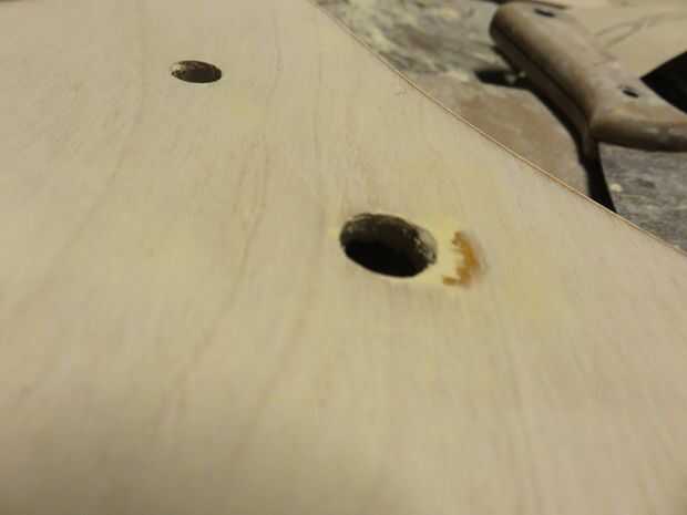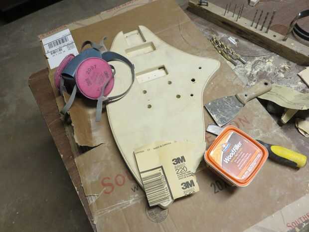 Relleno de madera extendida por todo el cuerpo de la guitarra con una espátula o cincel barato. Madera contrachapada tiene muchos vacíos que son muy evidentes en el borde. El relleno de madera también puede encubrir errores, como mi grano partir mientras el pickup selector taladrado.