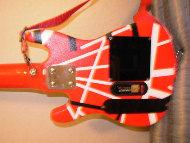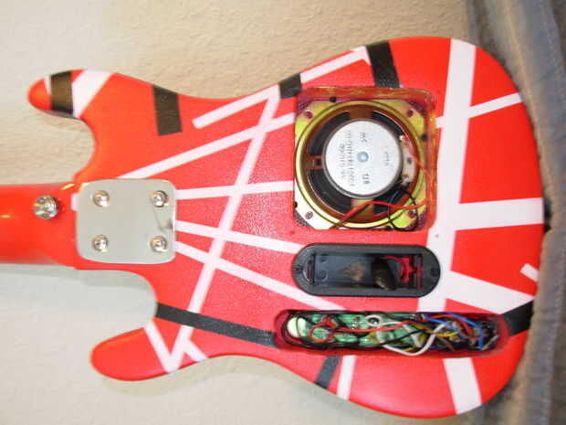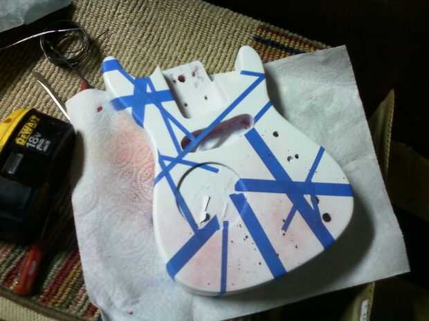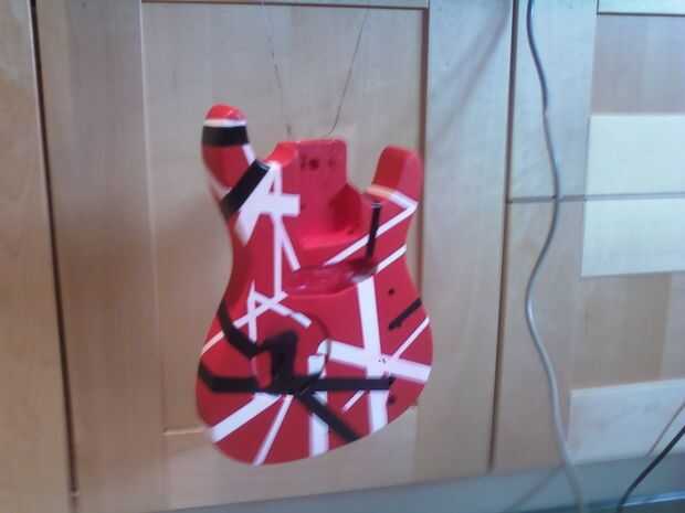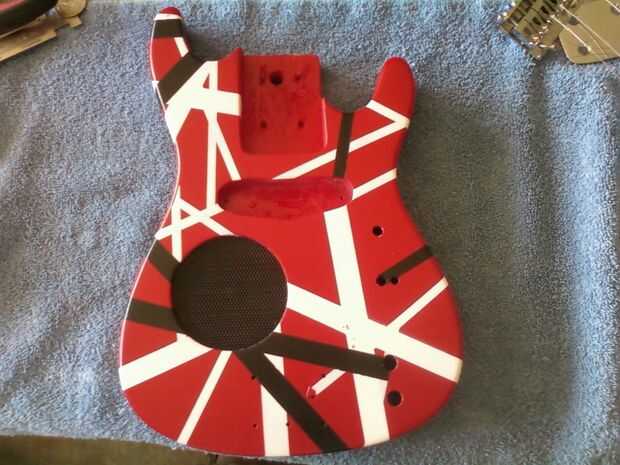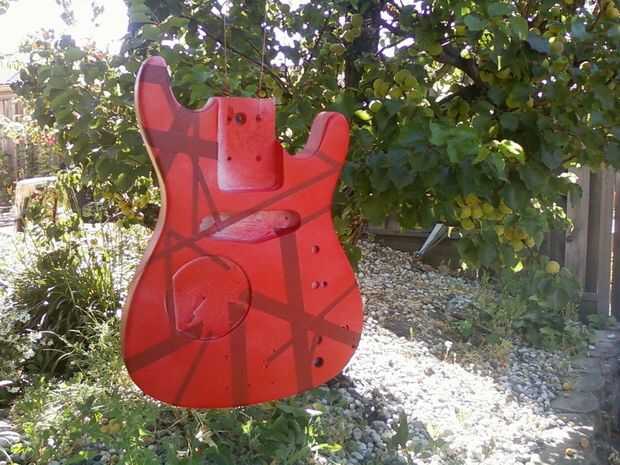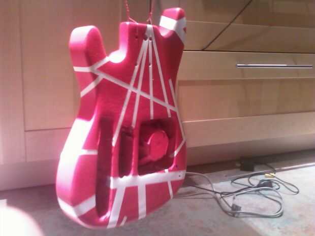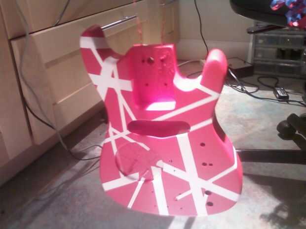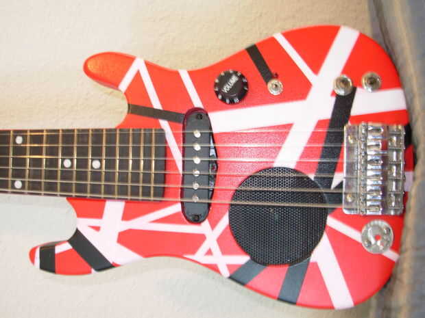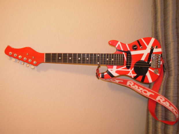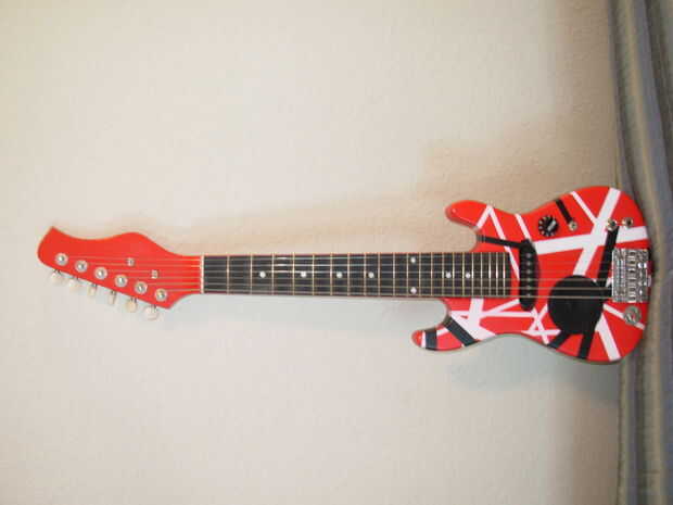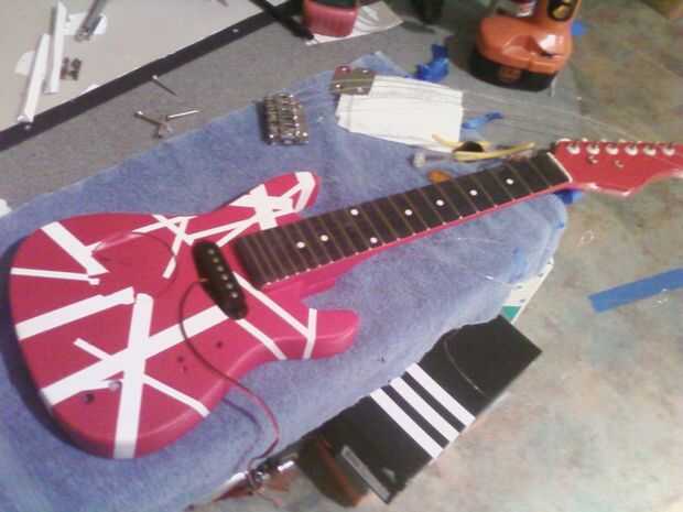 Este proyecto comenzó cuando mi amigo me dio su vieja guitarra para niños porque él no tiene tiempo o ganas de arreglarlo. Tan pronto como lo conseguí, desmontado completamente, entonces enarenada apagado el color rojo original y fue a trabajar pintura en verdadera moda de Eddie Van Halen. Con paciencia y una mano constante adhesiva, pude replicar razonablemente el diseño en la guitarra de Eddie. Irónicamente, esta guitarra suena horrible y su pequeño tamaño hace que sea casi injugable, pero hace un ornamento de la bonita pared y pedazo de conversación :)