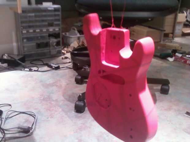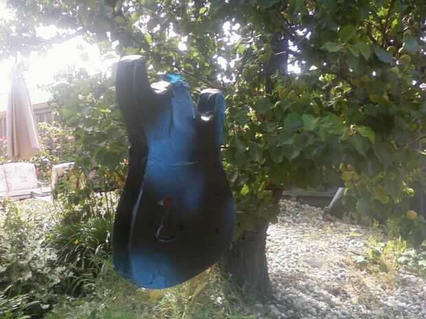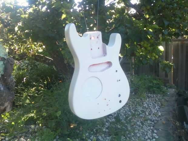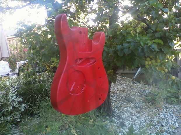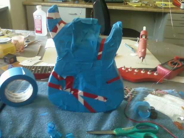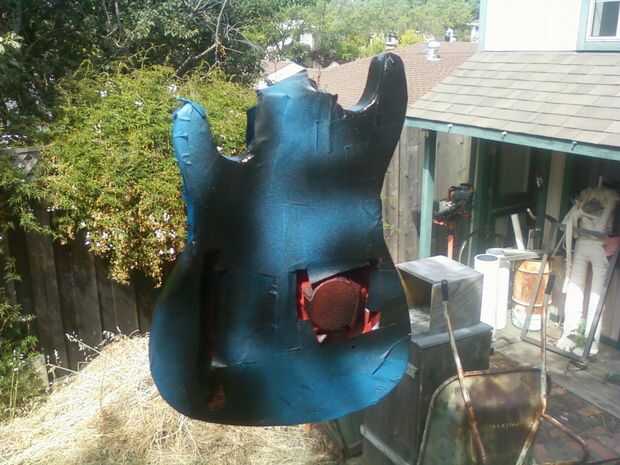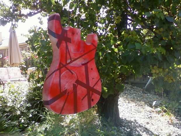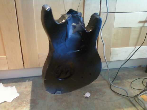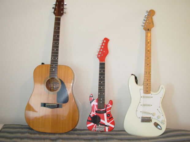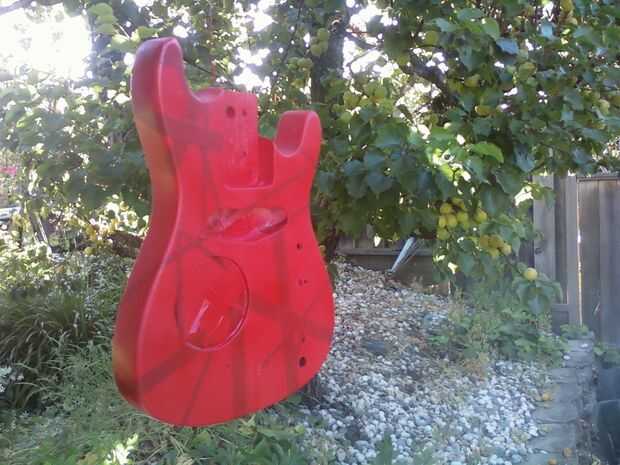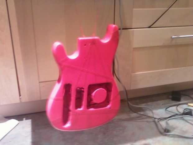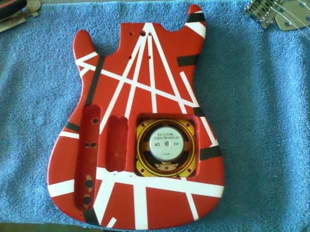 Este proyecto comenzó cuando mi amigo me dio su vieja guitarra para niños porque él no tiene tiempo o ganas de arreglarlo. Tan pronto como lo conseguí, desmontado completamente, entonces enarenada apagado el color rojo original y fue a trabajar pintura en verdadera moda de Eddie Van Halen. Con paciencia y una mano constante adhesiva, pude replicar razonablemente el diseño en la guitarra de Eddie. Irónicamente, esta guitarra suena horrible y su pequeño tamaño hace que sea casi injugable, pero hace un ornamento de la bonita pared y pedazo de conversación :)