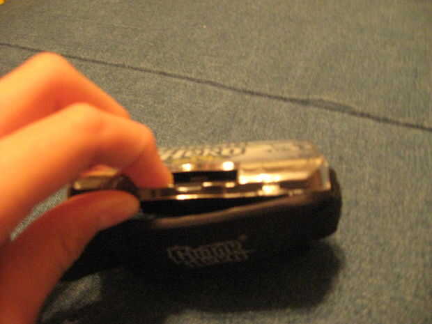 Para la piel original hacia fuera, primero debe preparar el GG para apertura. Doblar la cinta hacia atrás y tomar la aguja pick out (Foto 1). Abrir apalancando la parte clara de plástico de la parte negra por el titular de lápiz de selección en ambos lados (Foto 2) y quitar la piel original.