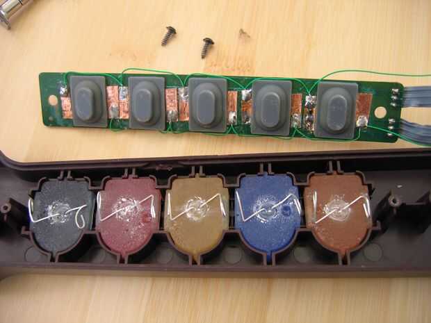 Aquí puedes ver el plan original para el cableado. Cada conjunto de cinco pastillas de cobre está conectado juntos y los cables a la derecha en la foto van a la batería.