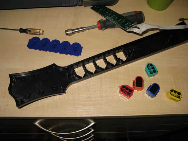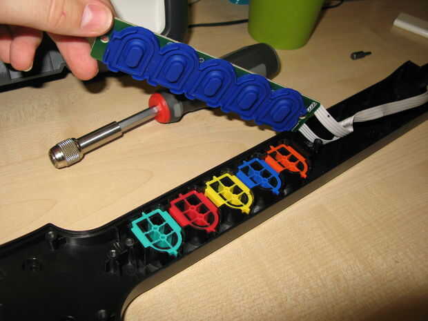 Quitar la goma azul pad de los botones y póngala a un lado - esto revelará los botones de traste. Ahora puede quitar estas demasiado.