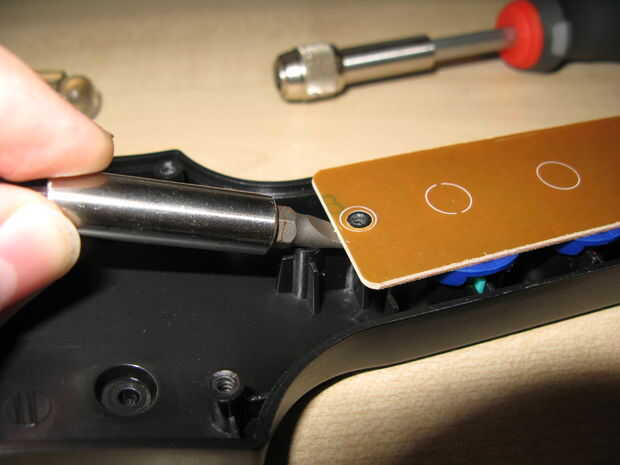 Utilice un destornillador plano toda para quitar la placa de circuito. Es un ajuste apretado en los postes de plástico, pero si eres cuidadoso no debe dañar la Junta.