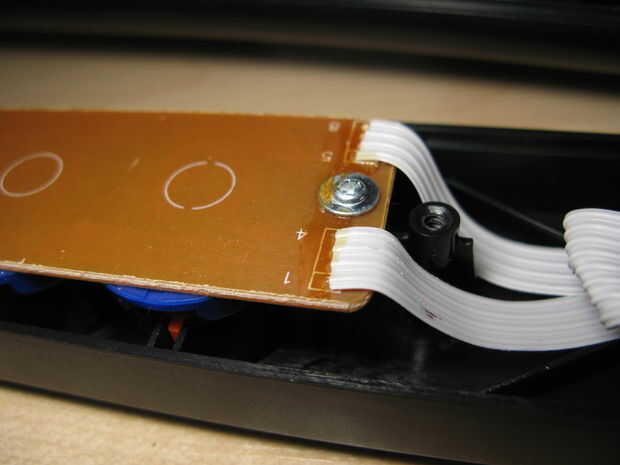 Cuidadosamente levante la placa de circuito y póngala a un lado. Tenga particularmente cuidado de no atrapar o doble el cable de cinta en cualquier punto ya que es bastante delicado.
