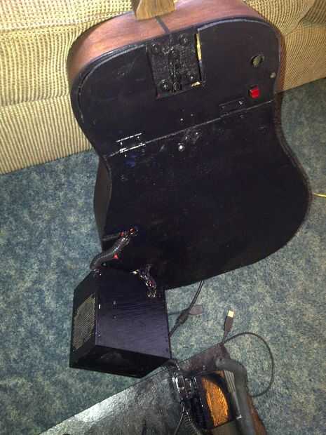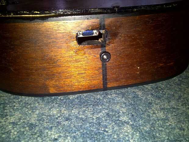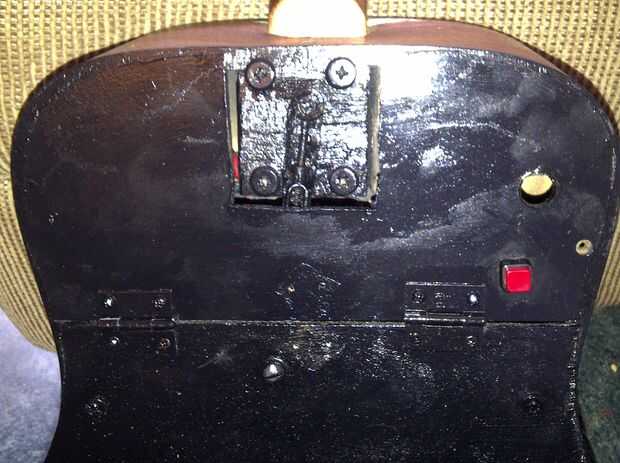 Para mantener en la PC y lo feo del camuflaje, me corte un pedazo de madera contrachapada fina a la forma de toda la parte trasera de la guitarra y había atornillada en su lugar. Entonces, Consejo de siguiente Sr. Jagger, pintó negro.