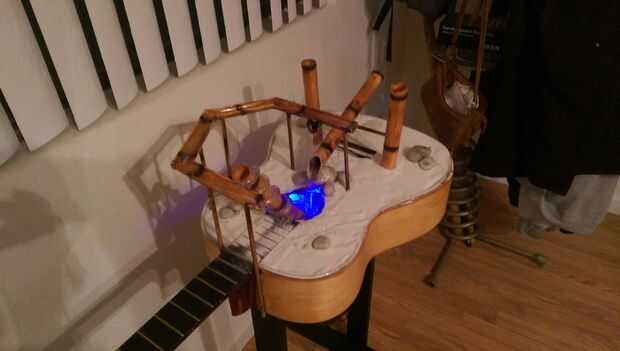Aquí es donde usted puede conseguir bastante de forma libre. Empecé poniendo algunos la tubería restante del vinilo alrededor del borde para asegurarse de que la arena se quedó en la guitarra. Pensé en usar EL alambre en el momento pero ya estaba wayy mi presupuesto de como cerca de $0 como sea posible. que puse la arena por toda la cara de la guitarra. Lo de colocar las rocas según un estilo más tradicional del jardín de rocas. como un truco extra poco agregué LEDs suministrados por Microtivity dentro del puerto de sonido. Por último había rastrillado de la arena, también en un estilo tradicional. Espero que usted encuentra algo útil y si lo hizo, asegúrese de votar!