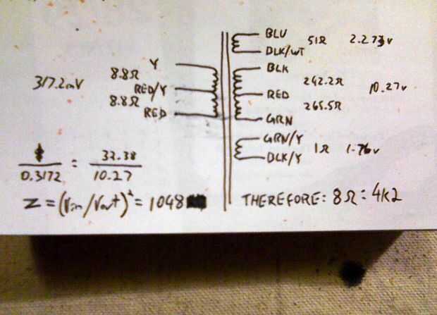 Primero giré mi matemáticas a la bobina de amarillo-rojo. Una relación de impedancia es el cociente del voltaje al cuadrado, o, (VoltageIn / VoltageOut) ^ 2. 10.27vAC (el voltaje en una bobina) dividido por el 0.3172vAC (el voltaje en el otro), al cuadrado, es igual a 1048. Mi objetivo es conectarlo a un altavoz de 8 Ohm--para 8 Ohm veces 1048 equivale a 8384 ohmios. Este es un transformador de salida push-pull para cada tubo de salida verá la mitad de eso, u ohmios 4192 (nosotros lo llamamos 4k 2 ohmios). Esta es una muy buena carga para la mayoría de las válvulas, con una bonificación de tener ese toque rojo/amarillo que nos permitiría una carga de 4 ohmios.