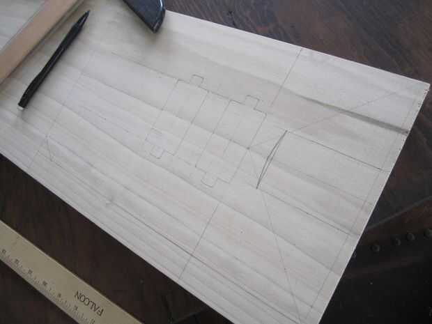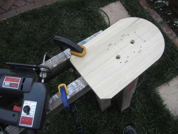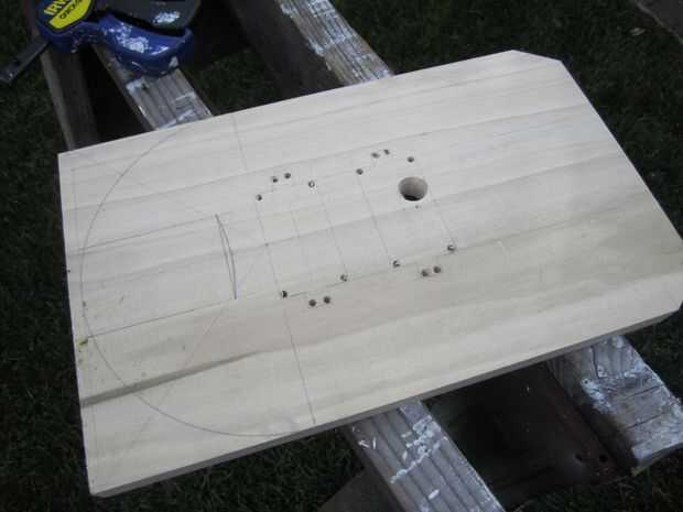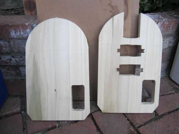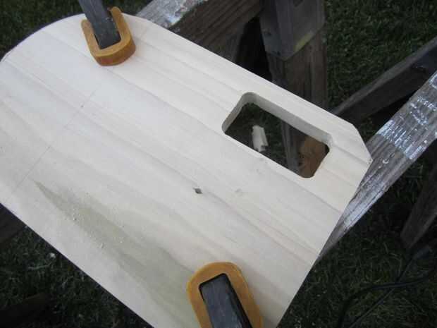 Después de hacer mi marca, modificado a partir de los planos, comencé a perforar los agujeros de las esquinas de las cavidades de la recolección. Luego corté las líneas rectas principales de las piezas de dos cuerpo con una sierra de mesa. Corté dos piezas al mismo tiempo, para asegurarse de que las formas emparejadas para arriba perfectamente. Utilizando una sierra de calar corte el redondeado apagado cabeza de apartado, así como los agujeros para los ligues y cuello en la mitad superior y el agujero para la electrónica en ambas mitades.