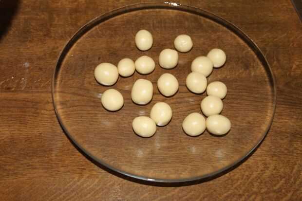 Hacer bolitas con las palmas. El tamaño de la bola debe ser un poco más grande que un Marble.Please Asegúrese de que no hay ningunas grietas en las bolas. Si no quiere romper mientras freír.