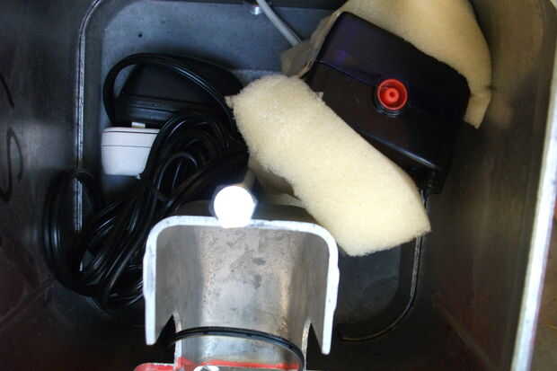 Dentro de la base de la máquina de gumball, ocupa el poder, bomba de aire para el filtro y el cableado para la luz. Yo realmente no cambia mucho este tiempo, excepto usando arandelas de caucho desde el principio y una sierra de calar para obtener un corte limpio para el cable de alimentación. Otra vez, envuelve la bomba de aire en espuma para evitar el golpeteo contra la base de metal. También he añadido de fieltro a la parte inferior para que no rayar cualquier superficie en. Una varilla roscada de 6" es fijar la tapa a la base.