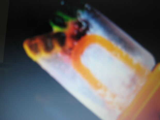 este es el experimento de Gominolas que Gominolas se añade clorato fundido, en tal ambiente rico en oxígeno con suficiente temperatura, ráfagas de Gominolas en la llama lila vigorosamente cuando contacto con clorato fundido. Gummy Bear y tubo hirvien