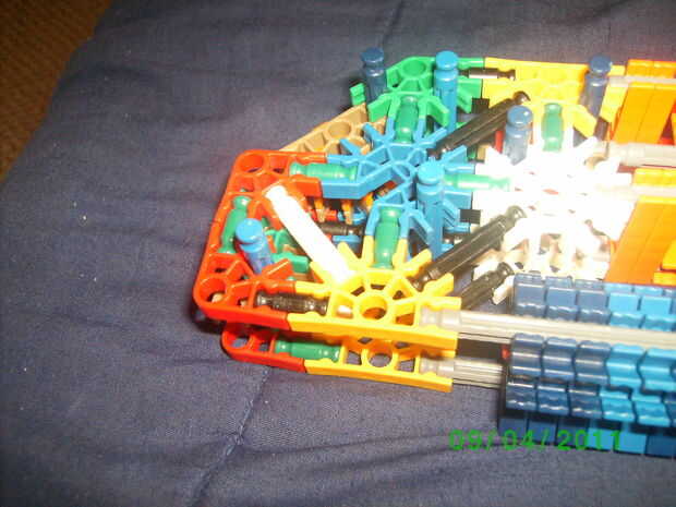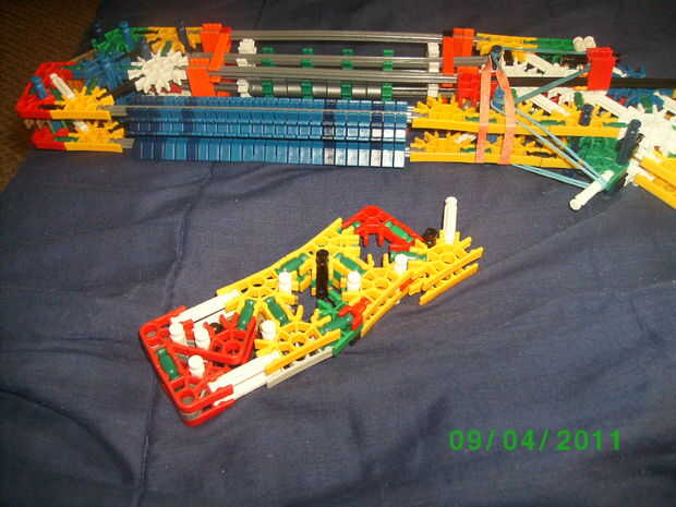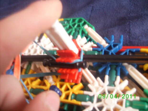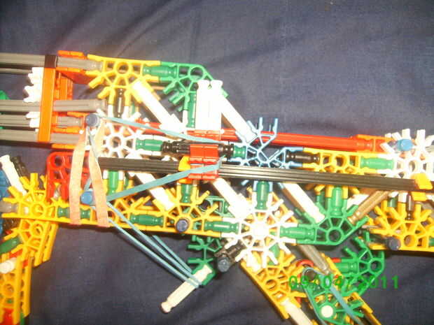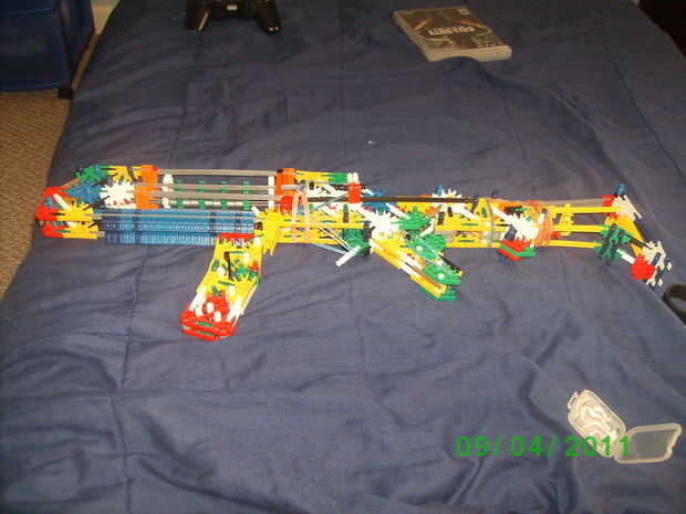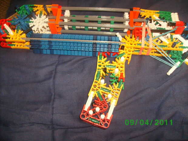 It is a though little K'nex gun that I made. Puede tirar una caña de K'nex blanco 8.5 pies (2,57 m). No es grande porque soy nuevo en instructables, pero merece la pena hacer y es bastante simple por lo que sólo toma unos muinets para construir. Perd