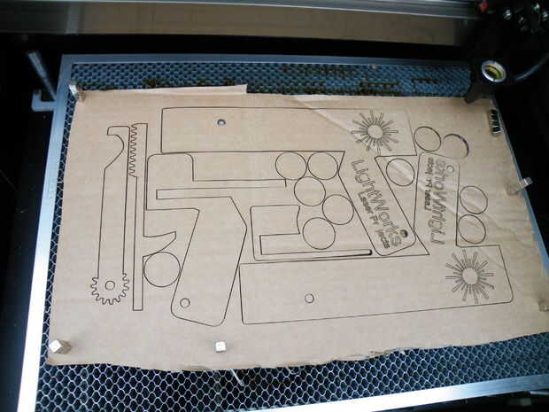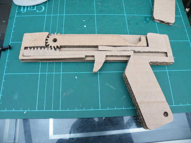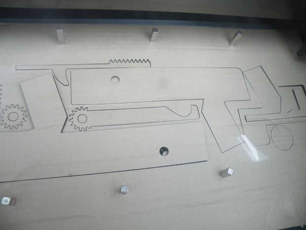 He encontrado foto de piñón y engranajes en línea y dibujó sobre ellos en Inkscape, y luego editado el brazo de lanzar en el engranaje, y extendió el bastidor recto en un slider y un gatillo.