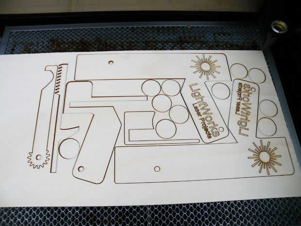 Las piezas de corte a velocidad 20, potencia 65%, la decoración se realizó en 20/20%. Para asegurarse de que los gráficos me alojé en el enfoque, configurar cosas para que los gráficos cortan primero, antes de nada cambió de puesto cuando piezas gratis.
