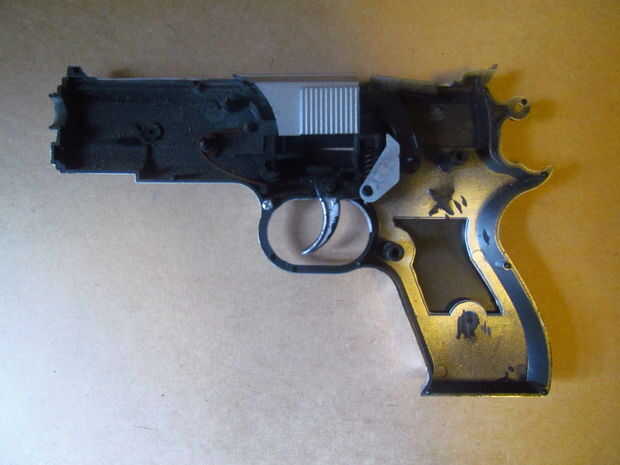 -Obtener los clavos que doblaron antes y toquen las puntas, haciendo forma de U. Mida la distancia entre las cabezas de los clavos. Taladre dos orificios que lejos aparte cerca del martillo de la pistola, uno en cada mitad.