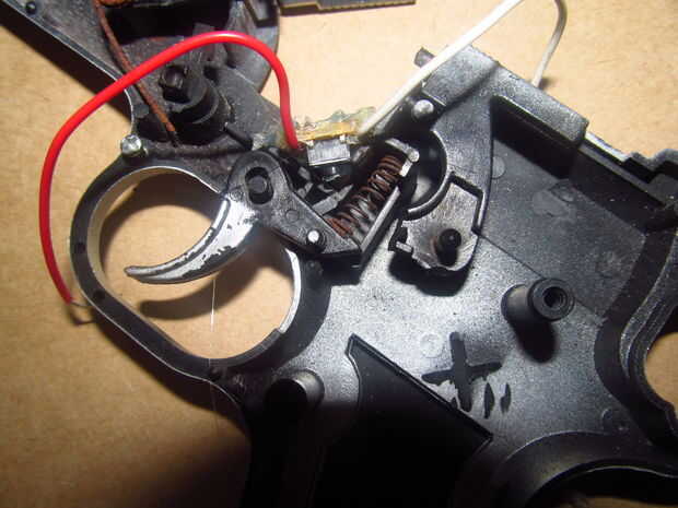-Pegamento caliente el interruptor momentáneo sobre el gatillo para que cuando se aprieta el gatillo se activa el interruptor.