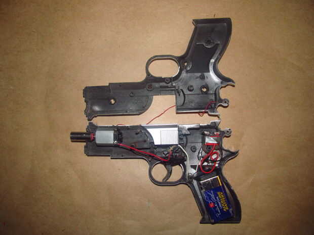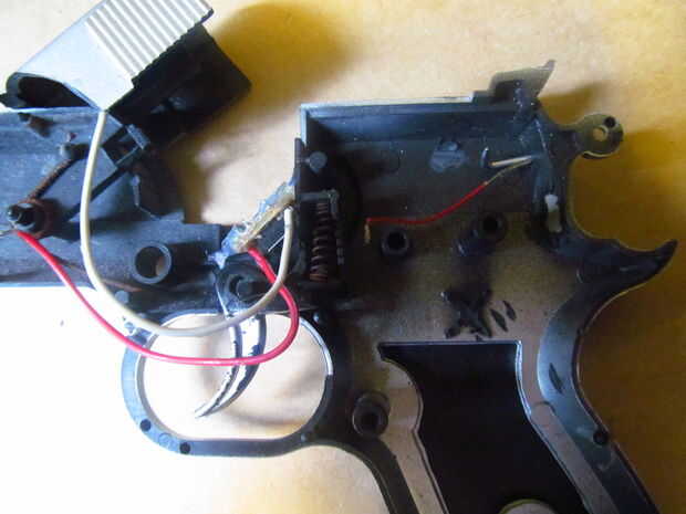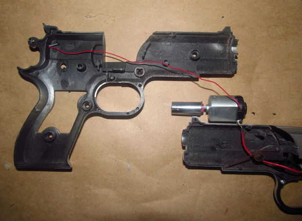 -Soldar un alambre largo al otro clavo y pegan el clavo y el alambre a través del agujero en la otra mitad de la pistola. Soldar el cable al motor terminal.