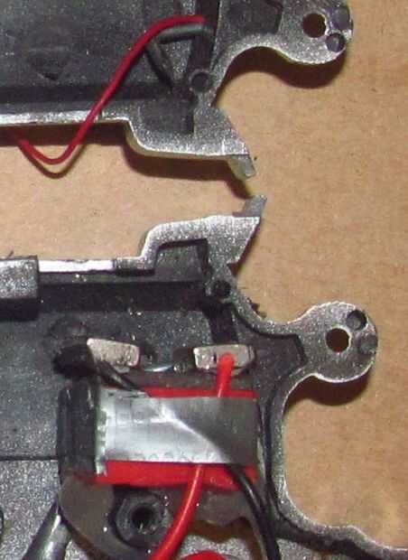 -Encolar el motor en su lugar con cerca de 1/2 de pulgada del eje que sobresale de la boca. Péguelo en la misma mitad de la pistola como el interruptor momentáneo.