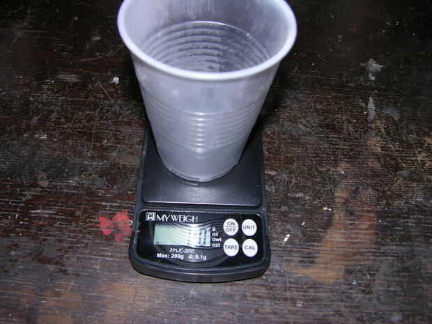 1. Si usas una balanza eléctrica, coloque un recipiente (yo uso vasos dixie) en medir los productos químicos en. Presione y mantenga presionado el botón "tare" considerar el peso adicional y se establece en cero (es decir, que el peso de la Copa no se tendrán en efecto cuando usted mida el peso de la chemcials)