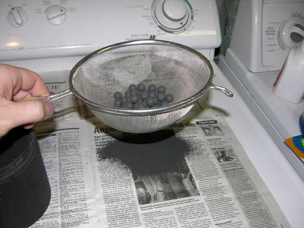 3. suavemente agite el filtro hasta que la pólvora ha caído a través de los agujeros al periódico y quedan todas las bolas de plomo.