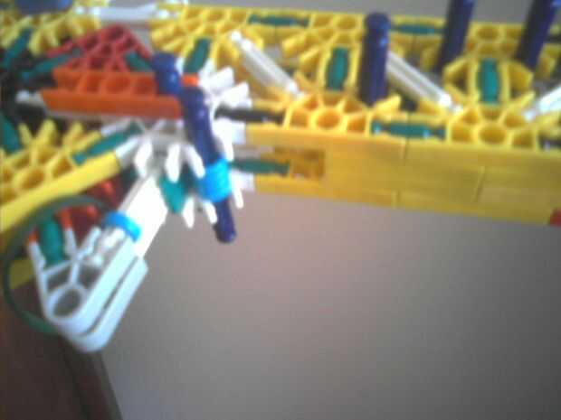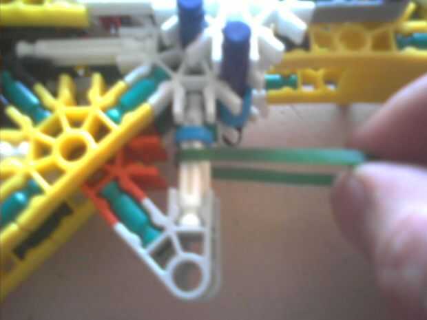Foto 6: Gire el copo de nieve en sentido horario hasta que la barra azul está en la esquina del sudoeste, y la otra barra azul es directamente debajo del centro. Va a ser difícil de trabajar más allá de lo otros azul sin disconecting tampoco. Coloque la barra verde y gris del conector como se muestra. Repetir en ambos lados.