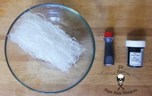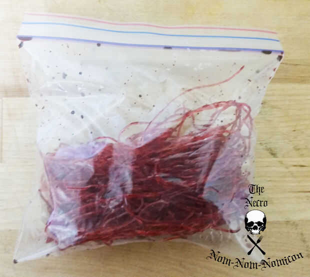 Tomar tus fideos crudos y ponerlos en la bolsa de plástico. Agregar el agua tibia y suficiente tinte rojo y negro para lograr un Borgoña profundo.