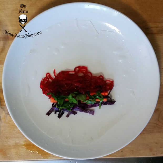 En el centro inferior de su contenedor, coloque una capa de repollo y zanahoria, cubierto con una polvoreda ligera de cilantro, menta y albahaca. Capa de un montón de sus "bloodworms" directamente encima de las verduras.