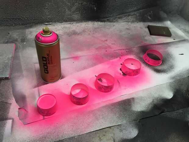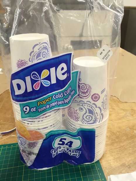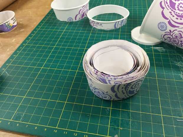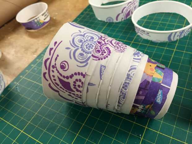Cortar las tazas hasta 1-1/4" astillas para pila uno dentro del otro. Pintura de aerosol si usted lilke.