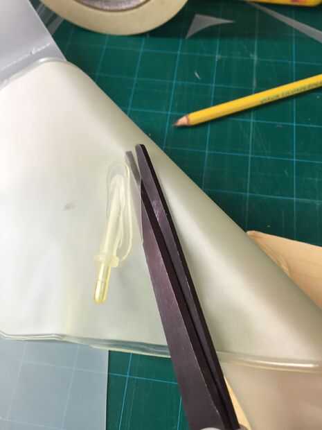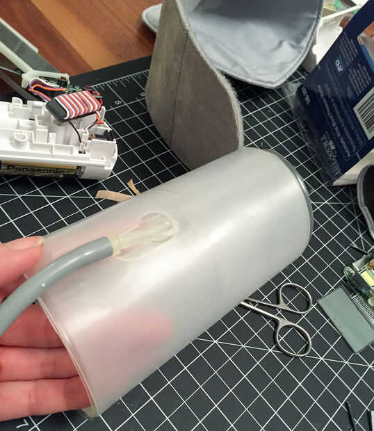 Para sacar el manguito plástico, desconecte el tubo gris de la vejiga suave. Para ello, quitar el tubo gris y respaldo el conector de salida de la vejiga.