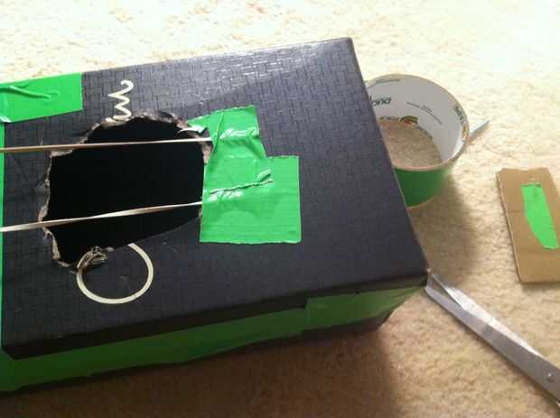 Materiales:✴ Pintura✴ Sellador✴ la cartilla✴ La necesidad de almacenar cinta adhesiva rollos✴ Negro cinta aislante✴ Pegamento✴Roll de envoltura alegrePaso 1: Pintar la caja de zapatos Paso 1: Cortar agujeros en ambos extremos de la caja, sobre la gra