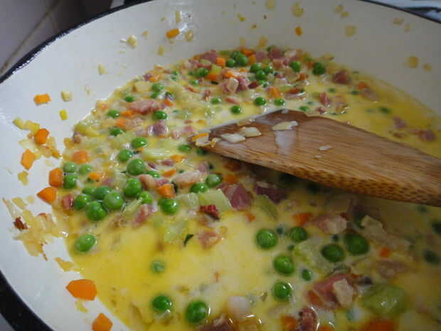 5. A continuación añadir la nata y los guisantes.