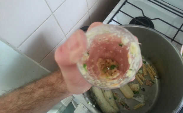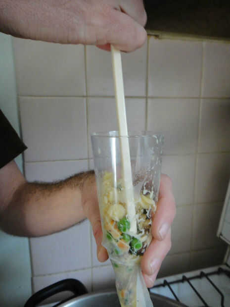 Para ello, añado una cuchara llena de pasta en el cuerno de embutido y cram down con el extremo de una cuchara. No el más sofisticado de los métodos, pero funciona... Prestar atención a los ruidos hermoso el video hace, no suena delicioso.