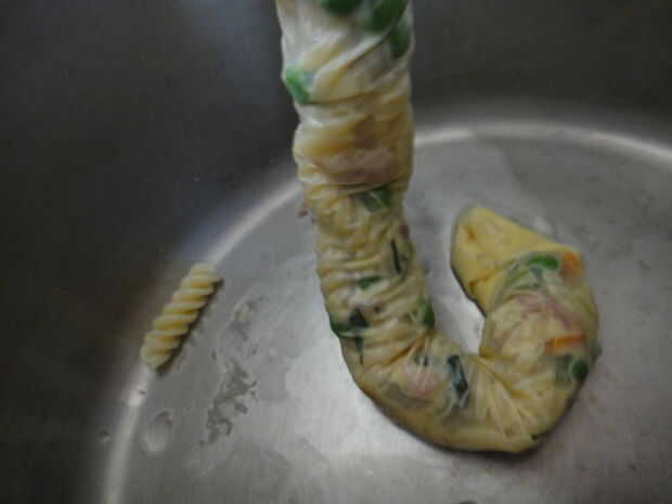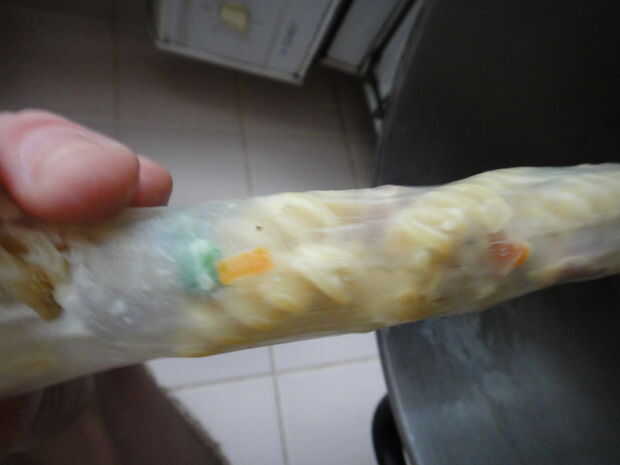 Finalmente debe tienen alrededor de un metro o tan de cena, atar el otro extremo y repetir el proceso hasta que está fuera de la pasta. He podido hacer 3 longitudes de intestinos con esto...