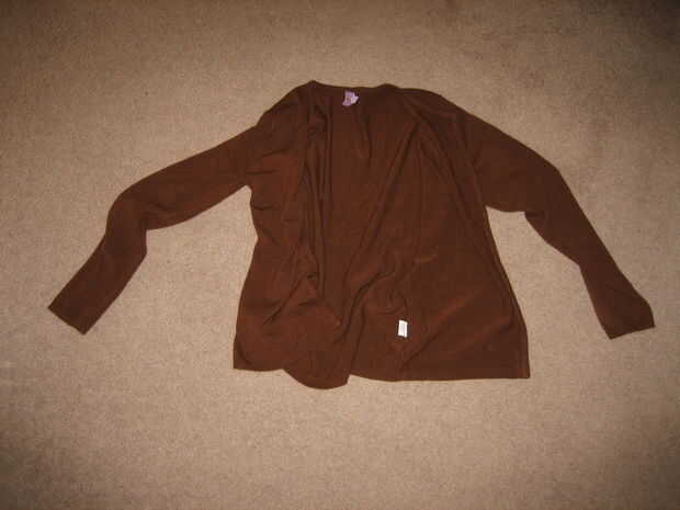 Comience con una visita a su local tienda segunda mano. Hemos conseguido recoger una blusa blanca ($6,25), puente feo marrón ($6,25) y una chaqueta marrón ($7,75), total $20,25; Bien.