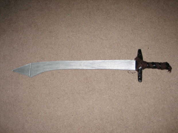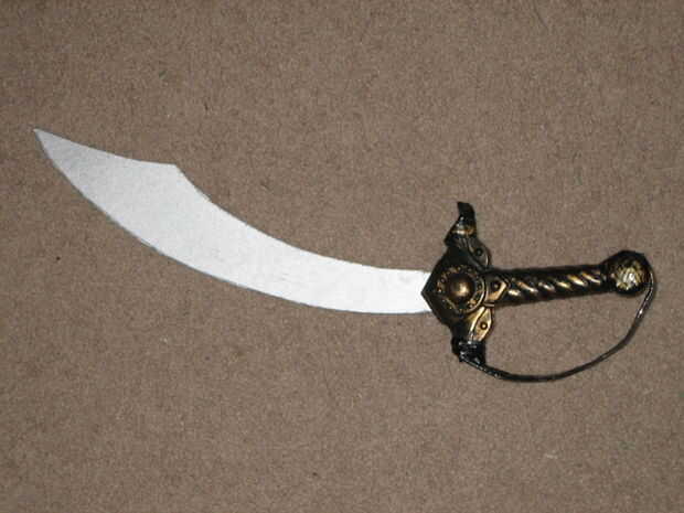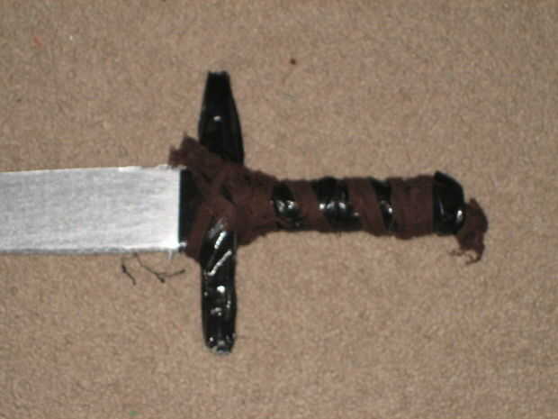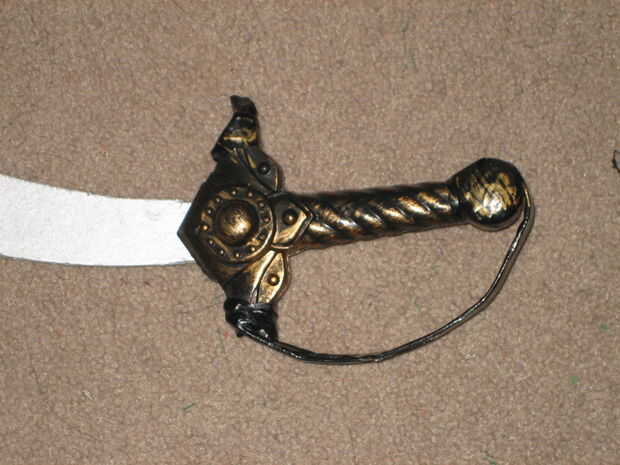 Espada del caballero, quería producir un protector de mano curva como se ve en muchas espadas de pirata. Esto se logró con una tira de cartón envuelto en cinta de tela negra. Fue atado con cinta adhesiva negra más. Para que coincida con el diseño de la empuñadura original, un marcador de oro fue utilizado para copiar el diseño original de la cinta negra.