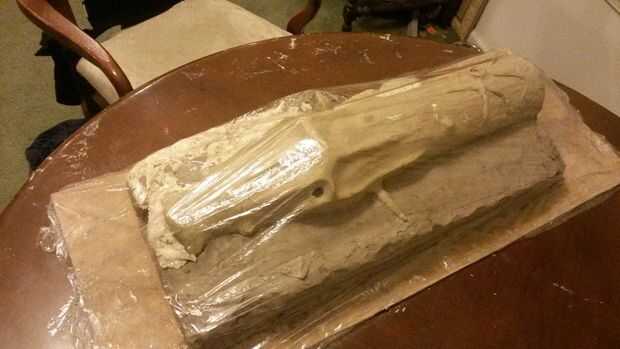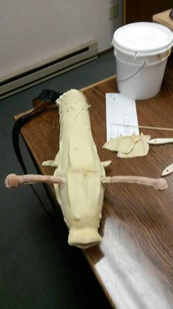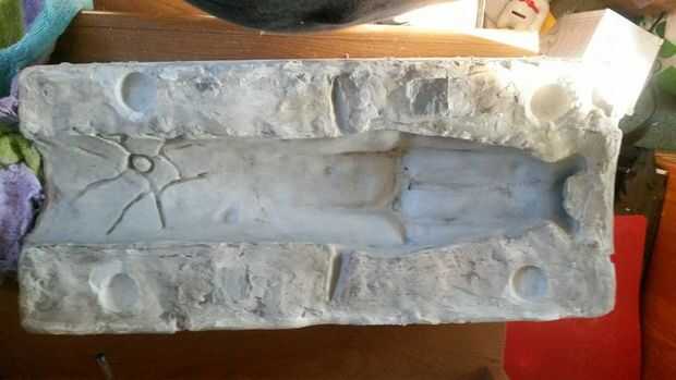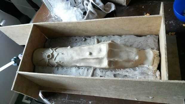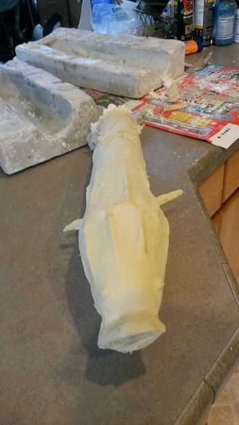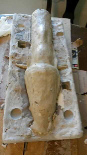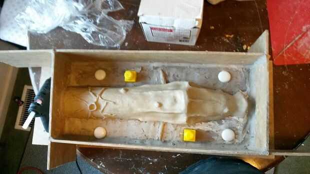 Así que el cuerpo de la sepia se hizo en casi la misma forma que los ojos, excepto en una escala mucho mayor. Apuesto a que este molde pesa menos de 50 libras y tuve que asegurar las mitades del molde con las correas del trinquete. Además me acordé de los puntos de palanca! JAJAJA también que dejó la base abierta para verter el látex, al igual que el molde del ojo