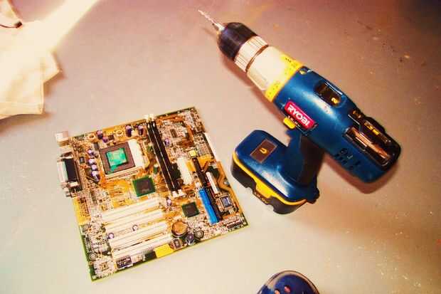 Utilizando el taladro y una broca de 1/16, perfore agujeros en la placa base. Taladré mina aproximadamente una pulgada de distancia, unos 3 cm. hacer seguro para evitar cualquier cosa que podría estar en su camino de destrucción; tejer alrededor o adaptarse a los obstáculos de alguna manera;]