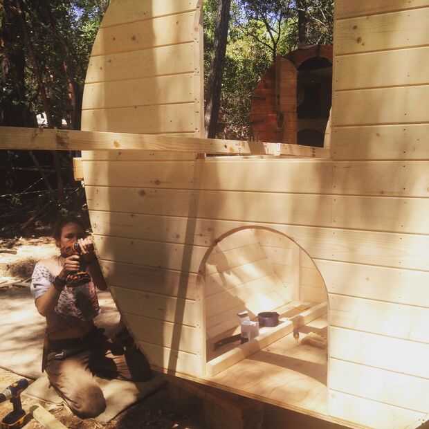 Para las paredes laterales, otra vez cortar la ranura, esta vez en un ángulo para que quede bien empotrada en el suelo. A continuación perfore previamente y atornillar para arriba a través del piso, con 3" tornillos cada pie o algo así. Pre-taladro y atornillar las paredes laterales y la pared mitad media preferiblemente con tornillos de cabeza plana ancha 2.5 pulgadas.