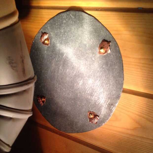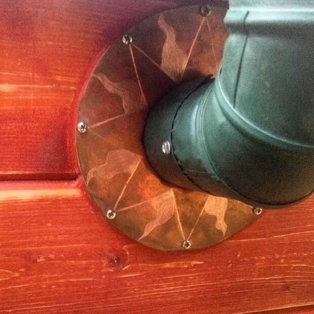 Nunca instalar una estufa, incluso uno tan pequeño en un espacio tan estrecha como la bodega en un carro, sin un protector de calor. Y me reconocimiento tampoco. Por suerte lo que queda del segundo cubo es apenas el tamaño correcto para un protector de calor para los lados y la parte posterior de la estufa, donde obtiene la estufa cerca de las paredes del vagón. Guarnición de cobre, respiradero deslizante y patas de pernos a levantarse del suelo son grandes, como una hoja de metal por debajo y alrededor de la estufa el suelo de protección. Una pieza circular de cobre obtiene la pila a través de la pared, con 1/4 de pulgada gruesa capa de alta temp silicona estufa sellador para aislar la pared de la pila.