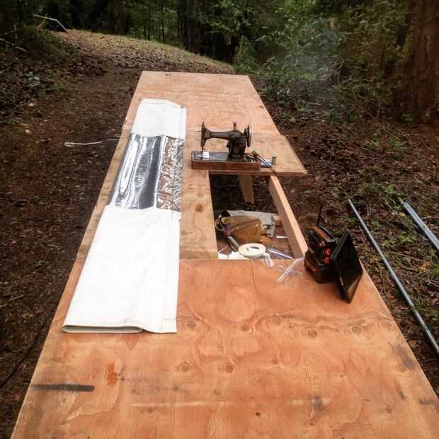 Felizmente, nuestra mesa pasó a ser en una ligera pendiente, dando al material una característica hacia fuera-alimentación super conveniente, que permite a una persona coser sin ayuda. Una manga con un tubo de EMT en él permite la azotea para ser fijado (grande en viento) así como algo para enrollar alrededor cuando quiera abrir un lado y dejar que la vista sin obstrucciones.