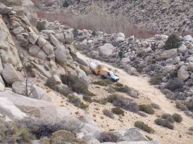 Ni que decir, tenía tanto peso como sea posible en el camión, salió al aire los neumáticos hasta 20 psi y arrastré a lo largo de cada vez que la carretera tiene áspera. Soportó el abuso sin queja. Al final del viaje lo llevé a unas pocas millas de la antigua carretera de carro en Valle de Panamint. El camino de Nadeau es una de las carreteras más duras en que he conducido, tuve que salir y explorar el camino con frecuencia, mover las rocas y comprobar ángulos de salida va dentro y fuera de lavados, etc.. En un momento tuve que arrastrar sobre una roca de diez pulgadas de alto (las ruedas del remolque son sólo 21inches). Ningún daño sostenido.