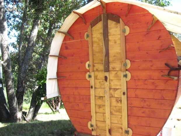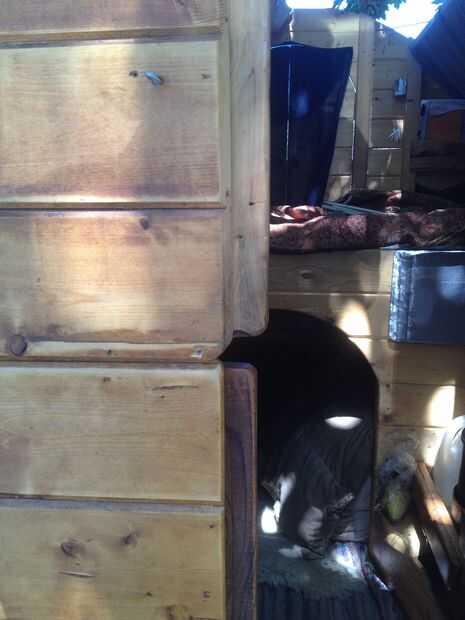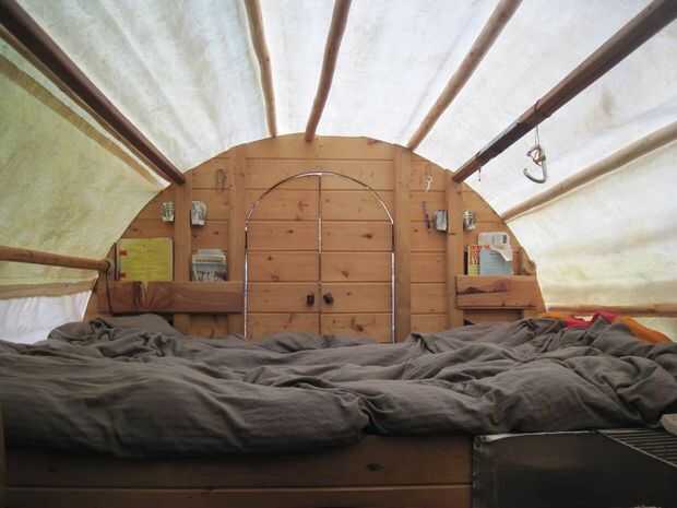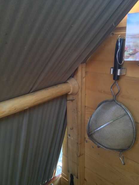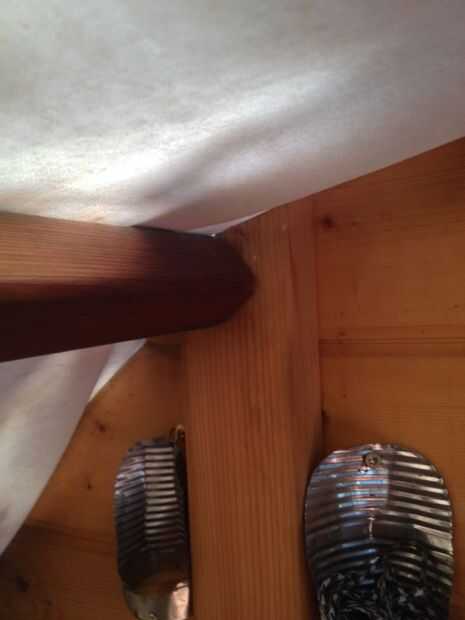 Hace los cabios de 2 x 2 y desde entonces han lentamente ha reemplazándolos con pequeños abetos, que la redondez es suave en la lona mientras toca lo menos posible para reducir la absorción de la lluvia. Utilicé tornillos de 4 pulgadas en éstos como 2 pulgadas de ellos entra en el perno prisionero y el revestimiento. Las dos vigas del techo extraíbles adicionales se fijan en esas cosas de taza fabricado para la celebración de pasador armario estantes. Si con éstos en un tornillo extra o se gire.