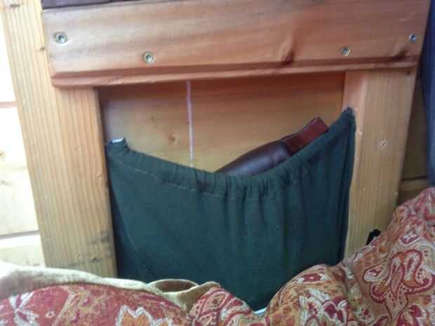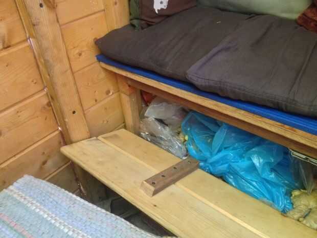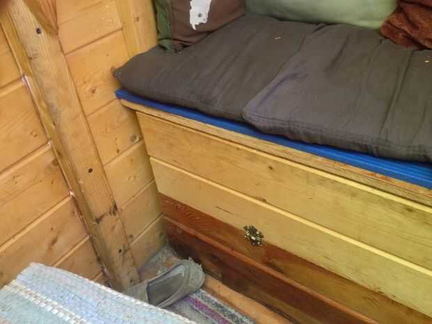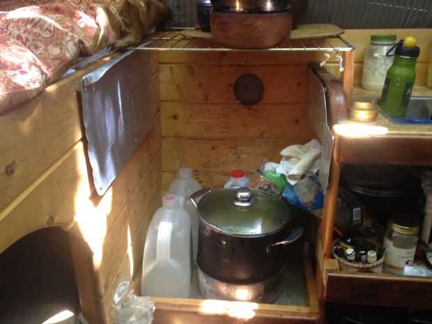 En el invierno el futón que había entonces en la cama empezaba a moho en el húmedo frío, por lo que se trasladó la estufa debajo de la cama y había calentado el carro de esa manera. Necesitaba un protector de calor en el techo estaba muy cerca de ella y arranca el calor hacia fuera, que brilla intensamente rojo cuando completamente stoked. Seca la cama hacia fuera y algo más. En la actualidad tiene tan caliente en la bodega (el poco espacio debajo de la cama) que poner una manta en la puerta y lo utilizó como un sauna.
